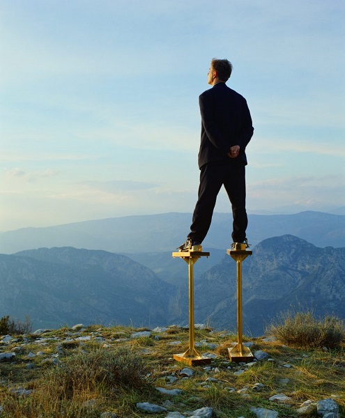 Dans la seconde hypothèse, les prothèses et subterfuges sont masqués, rendant l’illusion évidemment plus forte et incitant le spectateur à chercher, comme face à un prestidigitateur, « quel est le truc ». Ici encore, il s’agit de confronter l’homme statique, mutique, immuable dans sa tenue (dans tous les sens de ce terme) et le paysage, qu’il s’agisse d’une ligne d’horizon ou de la skyline hong-kongienne. Jeu sur la gravitation et chamboulement des horizontalités et verticalités fondent alors le travail de Ramette, même si, par moments, la combinaison entre position du personnage et point de vue sur le décor est trop ouvertement manipulée.