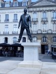 Les sculptures sont, naturellement, disséminées dans la ville, appartenant toutes à la même série des Éloges : une silhouette masculine à l’échelle 1, souvent debout sur un socle imposant, prenant une posture un peu décalée qui prend tout son sens à la lecture de sa légende. Éloge du pas de côté voit ainsi l’homme mettre un pied en dehors du socle, Éloge de la discrétion est tout de blanc vêtu afin de se fondre dans le mur contre lequel il se tient, Éloge de l’Adaptation permet, par la forme de son socle, de retrouver une position verticale nonobstant la pente du terrain etc… Entre nonsense et prise de possession de l’espace public, ces réalisations font intelligemment écho aux travaux photographiques dont une sélection est accrochée Passage Sainte-Croix.