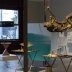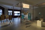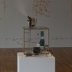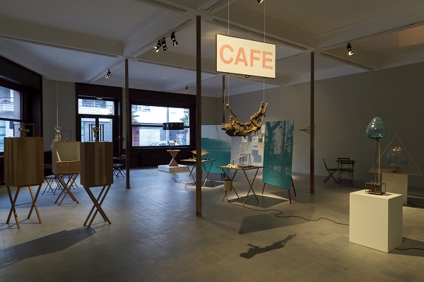 Au rez-de-chaussée, c’est une sorte de café qui est reconstitué (puisque, comme son nom l’indique, le Grand Café en fut un) : petites tables et chaises pliantes sont disposées au hasard, des quotidiens sont accrochés sur une structure métallique et il est proposé du véritable café aux visiteurs. Plastiquement parlant, le Portugais y installe une dizaine de petites créations, jouant sur l’idée de mécanisme et de mouvement circulaire : dispositifs de jeux d’eau, appareils constitués avec des poulies et chaînes, engins électriques, etc… La réutilisation et le recyclage se trouvent ainsi au cœur du processus, relayant le concept plus global de régénération sous-tendu par le propos autour du lieu. À côté de ces mécanismes, des petites sculptures aux formes indistinctes (dont on saisit la signification à la lecture de la légende, tel ce proto-buste féminin mal dégrossi intitulé République) et des petites maquettes, façon scènes de théâtre, où, selon le cas, une porte, une fenêtre ou une trappe sont ouvertes. Dans toutes ces créations se trouve sollicité l’imaginaire du visiteur déjà invité à se projeter dans le passé du lieu.
