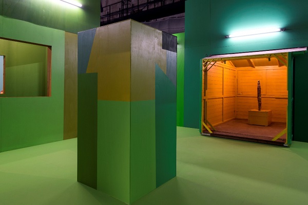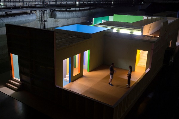 Ouvrir les portes au hasard, emprunter des escaliers sans savoir où ils nous mènent, se laisser aller à vagabonder au milieu des teintes vives, apercevoir d’autres spectateurs par une ouverture : telles sont certaines des actions qui nous sont offertes avec cette grande installation. Sans forcément chercher de signification autre que le pur plaisir de la déambulation aléatoire, on peut toutefois considérer qu’un espace aux murs verts, et doté d’un parallélépipède vert et marron en son centre, pourrait s’apparenter à un jardin tandis qu’une petite pièce fait écho au passé sous-marinier du lieu.