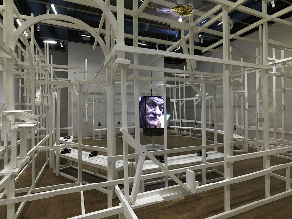 Autre vidéaste (qui, comme Marie Voignier, se trouve sélectionné deux ans tout juste après avoir été nommé pour le Prix Fondation d’Entreprise Ricard, traduisant la porosité des deux manifestations automnales et, surtout, le virage « jeuniste » pris par le Prix Marcel Duchamp depuis qu’il a couronné Cyprien Gaillard en 2010), Clément Cogitore continue une carrière éclair, saluée de toutes parts. Lauréat du Prix Marcel Duchamp pour 2018, l’Alsacien fut récompensé grâce à un film court, assemblage de vidéos piochées dans les banques d’images et sur lesquelles il a plaqué une voix off féminine un peu dramatisante. Si le propos n’est nullement novateur (scoop ! nous sommes abreuvés de et gouvernés par les images), on relèvera quand même une bonne concordance entre ce sujet et les conditions de monstration (écran fait de LED, très lumineux et rappelant les enseignes publicitaires, noir prononcé autour des spectateurs, bancs installés dans une sorte de boîte hermétique, renforçant l’impression d’être happé par l’écran). Dans la même logique, enfin, Mohamed Bourouissa fait intelligemment résonner objet de sa proposition (s’attacher au premier hôpital psychiatrique d’Algérie) et dispositif, avec son architecture tortueuse et sa circulation complexifiée, échos des tourments qui traversent les patients.
