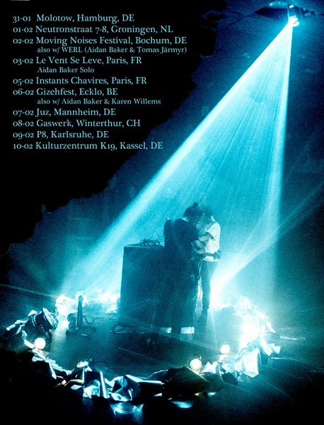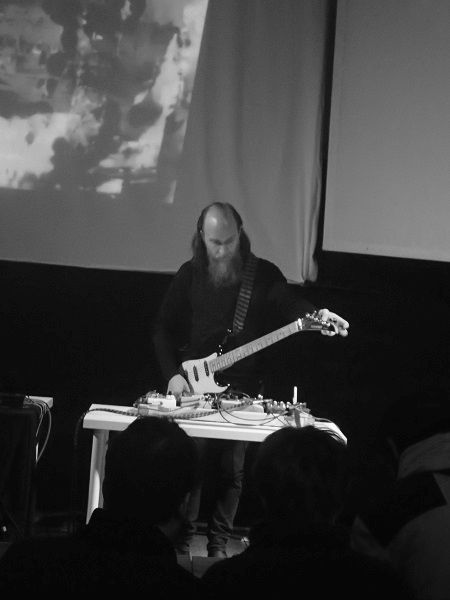 Alors qu’il est plus que régulièrement en concert dans notre pays, cela faisait un bon moment que nous n’avions pas vu Aidan Baker en solo. Il était donc pertinent, comme indiqué plus haut, de conjuguer tournée européenne de Nadja et set individuel du Canadien, armé de sa seule guitare électrique et de différents effets. Tapotée sur l’arrière du manche, la six-cordes livra quelques soubresauts sonores, avant de se trouver jouée au bottleneck ou délicatement grattée pour en faire sortir d’aériennes harmoniques (le médiator frottant les cordes avant ou après le bottleneck, puis avant ou après le capodastre). Nettement moins sombre et dense que dans notre souvenir, cette proposition s’ouvrait par conséquent sur des horizons plus amples.