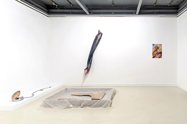 Avec leurs matériaux assez pauvres et leur approche plutôt abstraite, les deux artistes dialoguent ainsi, dans des salles où leurs œuvres sont mêlées : celles de la Française sont souvent accrochées aux murs tandis que celles de la Franco-Indienne sont systématiquement placées au sol. Il est vrai que ces formes de trompe-l’œil, sortes de morceaux de carlingue d’avion ou de voiture, semblables à des peaux d’animaux trônant comme des reliques dans de grands bacs en plastique et caisses de conservation muséales, ont besoin de cet espace au sol pour exister et donner à voir cette tromperie visuelle puisqu’en vérité, il s’agit d’agrégats de peintures qui se sont solidifiés en séchant. Une dimension narrative naît alors des travaux de Shanta Rao, assez forte et assurément plus pertinente que les assemblages de Mimosa Echard.