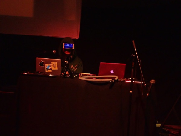 Face à une grosse vingtaine de personnes, ce fut tout d’abord Sabiwa qui s’installa, assise derrière deux laptops, capuche de sweat-shirt sur la tête et téléphone portable accroché devant ses yeux, l’écran tourné vers le public. La diffusion de vidéos sur ce petit appareil avait ainsi lieu en même temps que celles projetées sur le grand écran surplombant la scène, pas forcément synchrones mais intervenant globalement dans le même champ visuel, fait de collages et d’images saturées. Musicalement, la jeune femme livra une électronique parfois un peu appuyée, parfois plus légère, un peu répétitive cependant mais décente pour une entrée en matière. Afin de renouveler un peu le propos, la Taïwanaise fut rejointe, sur deux morceaux, par un instrumentiste jouant de la flûte traversière, soit de manière traditionnelle, soit affublée d’un tube en plastique, façon mélodica bricolé. Plutôt pertinent, cet apport donna de la consistance à l’ensemble.