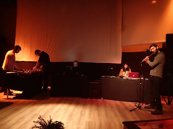 Afin de souligner la cohérence du plateau du soir, les cinq musiciens se retrouvèrent, une fois le set de Joaquim terminé, pour une improvisation un peu fouillie (c’est le jeu !) mais permettant quand même de reconnaître les éléments amenés par chacun, entre grondements lointains, mélodies saturées et samples urbains.