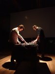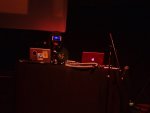 Après une pause un rien trop longue, pendant laquelle une table avait été disposée au centre de l’espace, deux Français s’installèrent de part et d’autre de celle-ci. Connus pour leurs travaux respectifs en tant que Witxes et Blackthread (nous avons déjà relaté plusieurs concerts de ces deux musiciens), Maxime Vavasseur et Pierre-Georges Desenfant ont commencé à travailler ensemble il y a un peu moins de deux ans. Dans une logique de forte improvisation, leur drone laissait à chacun une place assez identifiable, aussi bien visuellement qu’instrumentalement. Pendant que le premier assurait la partie plus mélodique, jouant sur ses contrôleurs et pads lumineux, adjoignant des sonorités parfois oniriques (simili-pépiements d’oiseaux, bruits aquatiques), le second générait diverses nappes plus ou moins grésillantes. Pour y parvenir, il jouait avec de courts câbles mini-jacks colorés, qu’il branchait et débranchait de sa grande machine. Le duo assura ainsi une belle occupation de l’espace sonore, mixant glitchs, nappes et propositions micro-électroniques.