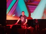 De fait, après le Français, ce fut le tour de l’une des têtes d’affiche du festival qui sut, au reste, conquérir le public d’entrée en dédiant son set à Frédéric Hanak, moitié de dDamage, décédé en septembre dernier. Placé au centre de l’espace, Christ. se posta devant l’écran chargé de diffuser des vidéos, façon dessins animés 80’s, de formes pyramidales ou semblables à des diamants, aux couleurs chatoyantes. Cette esthétique se montrait pleinement en accord avec les compositions de l’Anglais et leurs mélodies jouées en direct au synthé, tandis que les pulsations étaient envoyées depuis le laptop. Se réservant 2 ou 3 secondes de pause entre chaque titre, le temps de savourer les applaudissements (schéma qui cassa un peu le fil), Chris Horne sut alterner rythmiques nettes et parfois plus « crunchys » ; dans les deux cas, celles-ci étaient toujours en soutien de mélodies oniriques, claires et savoureuses.