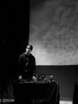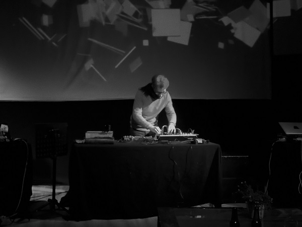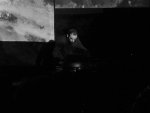 Place enfin à Giulio Aldinucci, posté au milieu de l’espace, qui lança de ses machines des sortes de vocalises féminines couplées à des vents électroniques, à la saturation progressive. La conjonction de ses trois composantes produisit quelque chose d’assez beau, par son éclat et son caractère aérien. À la limite du larsen par endroits, perclus de quelques crépitations ou de roulements d’orage, les titres de l’Italien prenaient occupation de l’espace, déployant même des percées plus lumineuses, en même temps que, sur l’écran, des ronds de lumière non nets firent aussi leur apparition. Pour terminer, les vocalises féminines revinrent, dans un registre à l’arrière-plan moins riche, plus épuré, impeccable pour un retour au calme après les passages plus opaques qu’offrirent chacun des trois sets de ce plateau diablement homogène.