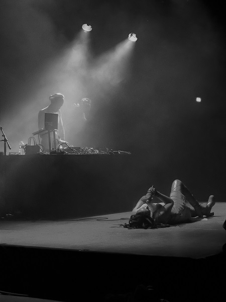 Alors qu’on aurait attendu que le set ne décollât à cet instant, d’autant plus que le public s’était effectivement mis debout et semblait bien parti pour secouer la tête en cadence, Mhysa replia ses beats et ligota ses pieds et mains dans le fil de son micro, avant de s’allonger sur l’estrade, pour de nouveaux morceaux plus dépouillés. Certes portés par la voix de la jeune femme, ils parurent un peu plats, voire atones, et, surtout, un décalage naquit entre les postures très démonstratives de l’artiste (scène arpentée de long en large, simili-twerk, jeu de hanches et d’épaules) et la musique qui restait ainsi plutôt en retrait. À nouveau, la configuration de la Dynamo ne jouait pas nécessairement en la faveur d’une réception optimisée de ce concert : public trop peu nombreux pour se masser autour de la scène, laissant un trop grand espace entre l’estrade et les premiers rangs, et accentuant ainsi le décalage évoqué précédemment…