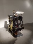 Ce dialogue entre les époques, les machines et les techniques se double, au surplus, de plusieurs effets miroirs au sein même du parcours : la tapisserie est dédoublée, les œuvres se réfléchissent entre elles et une presse d’imprimerie est découpée en deux dans la longueur comme s’il s’agissait de l’ausculter (Half A4 (Or King And Queen)). Ne se plaçant jamais dans la nostalgie, Starling opte ainsi plutôt pour une forme de rétrofuturisme un peu fasciné ou admiratif de la permanence de ces techniques légèrement désuètes. Dès l’entrée de l’exposition, au reste, on se trouve accueilli par l’escargot de Sesame Street (autre madeleine !) dont la voix française nous rappelle que l’espace du Plateau était, autrefois, celui des studios d’enregistrement de la Société Française de Production (Ernest, R2D2, Trépido (Parler Aux Humains)).