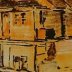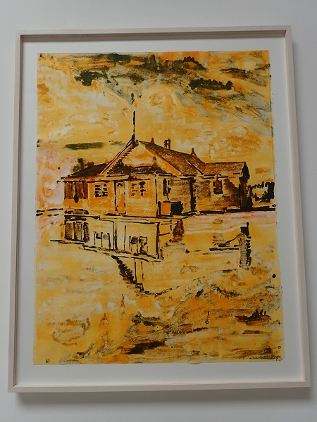 Tandis que les gammes de couleur de ces voiles (ocres, jaunes, bruns) se trouvent renforcées par une graisse apposée autour des sujets (comme un fixateur), les tonalités des peintures sur châssis, accrochées en périphérie, vont chercher des rouges, des violets ou des bleus. Les motifs et les médiums se diversifient aussi puisqu’on y trouve une maison flottante (Flooded House (Pale)) ou des sculptures de lutteurs, eux aussi aux traits très peu dessinés. Avec ces deux échelles, le travail de Claire Tabouret trouve donc deux terrains d’expression aussi convaincants l’un que l’autre et s’accompagne, au surplus, d’une belle recherche sur le support.
