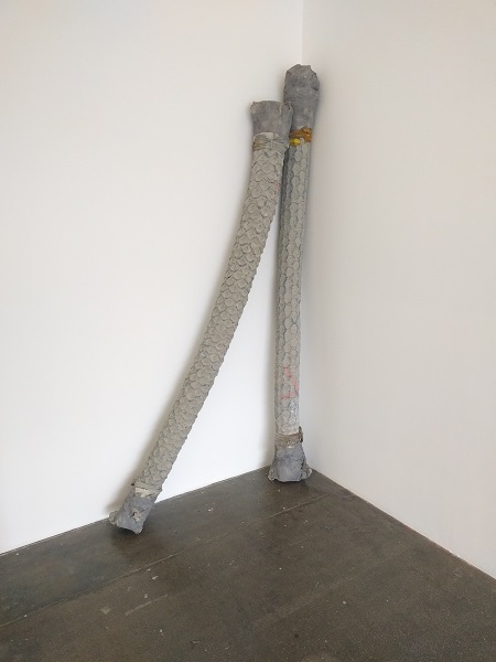 Si la tonalité d’ensemble ne souffre donc nullement d’hétérogénéité, faisant montre d’une cohérence certaine et démontrant la sûreté du choix opéré en amont par Sarah Tritz, on trouvera pourtant, quitte à passer pour un éternel insatisfait, que, précisément, le tout se révèle être un peu trop univoque, presque répétitif, voire lassant sur la longueur de la quarantaine de propositions ici exposées. En forçant un peu le trait, et avec un brin de provocation, on pourrait même aller jusqu’à avancer que le propos, à force d’être asséné de la sorte, nous entraînerait à des accès de machisme, juste pour le plaisir de prendre le contrepied. Dans ce contexte, les gestes plastiques finissent par passer derrière le message transmis par cette accumulation, jusqu’à arriver au bout du parcours où deux troncs de palmier de Stéphanie Cherpin (artiste fort appréciée de nos pages et que nous n’avions plus croisée depuis 2012), tous simples dans leur réalisation (couches de béton superposées, serties de gros élastiques à leurs extrémités) et non superflus dans leur expression (un minimalisme rudimentaire mais pertinent), nous laissent une très bonne impression finale.