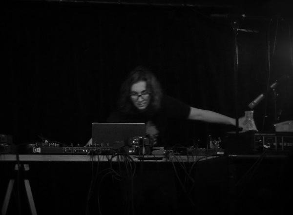 Pour débuter, Valérie Vivancos s’était installée au milieu du public, assis en rond autour de sa table. Tenant d’une main un capteur, la musicienne y grattait, de l’autre, un balai de cymbale ou une pierre, afin de créer une perturbation sonore qu’elle mêlait à de petits grondements et souffles envoyés de son laptop. Une autre machine lui permettait d’ajouter une note tenue assez aigue, quelques bruits métalliques, des vocalises, des grincements de bois, des bruissements divers ou de mini-couinements. Entre climat anxiogène et faux field recordings, le set de la Française offrit aussi quelques pointes acérées et des tremblements plus incertains, dans un format minimal et contenu.