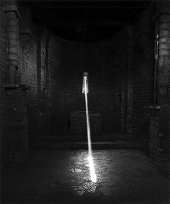 Affleure également une certaine dimension mystique dans, par exemple, sa série Sonnenstand, suite de photographies prises dans des petits édifices espagnols ponctuant le chemin de Saint-Jacques-de-Compostelle. Elle y parvient à saisir le soleil qui passe par une meurtrière, faisant alors apparaître un faisceau lumineux, conférant donc cet aspect irrationnel. Celui-ci est toutefois contrebalancé par la juxtaposition de plusieurs tirages pris tout au long de la même journée, permettant de voir le déplacement du rai de lumière, façon cadran solaire qui nous ramène à la matérialité du temps qui passe. Autre impression un peu mystérieuse avec sa seule photographie en couleur, prise à Palmyre, dans la Vallée de la Mort, le Temple de Bêl au loin : nimbé d’un halo, comme si le vent faisait se soulever le sable, le cliché dégage un sentiment d’irréalité cotonneuse.
