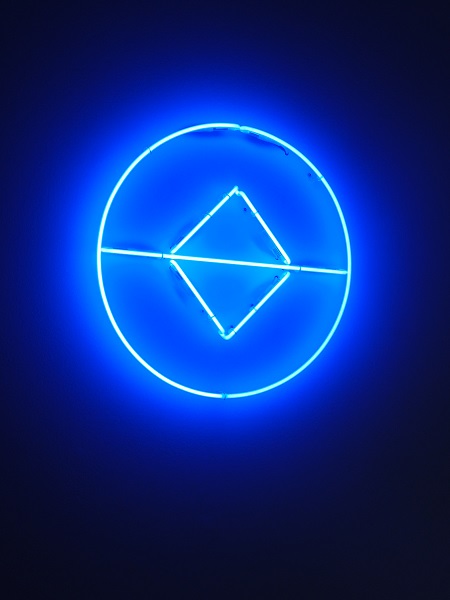 Invité à faire naviguer son regard, le spectateur se trouve donc, lui aussi, acteur d’une forme de voyage, baigné dans les couleurs émanant du film, pris dans cette quête initiatique et un peu perdu à son tour. Accréditant ce sentiment d’effectuer une forme de jeu de piste, la présence de symboles en néon au début et au milieu du parcours (respectivement Signal (Approach) et Signal (Summit)), comme les découpes triangulaires du vinyle noir qui recouvre certaines baies vitrées (Signal (Shadow)) invite le visiteur à tenter de (re)trouver son chemin dans ce qui peut se lire comme une vaste installation, mais aussi comme une forme de trip dont la station finale serait une vidéo de lignes noires et blanches au clignotement psychédélique (Conjuring).