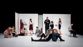 Non content de dérouler le canevas de la dramaturgie, Christophe Rauck joue donc volontiers sur l’imbrication de ces trois sources et, dès le début de la pièce, mêle les niveaux de discours et les dimensions narratives. Se lançant dans une perspective méta-théâtrale, une comédienne endosse le rôle de Jean-Luc Lagarce lisant des extraits de son Journal, d’autres comédiens présentent le(s) personnage(s) qu’ils vont interpréter par la suite, une autre actrice surgit sur le plateau, jouant Madame Tschissik, sorte de chœur antique (issue de Nous les Héros), qui va commenter l’action de manière assez décalée et drolatique. Compte tenu de ces simili-préambules, la pièce paraît mettre un temps infini à démarrer véritablement, passant par toutes ces circonvolutions, redoublées par les circonvolutions grammaticales ou dans l’expression des intervenants, dont les phrases paraissent interminables.