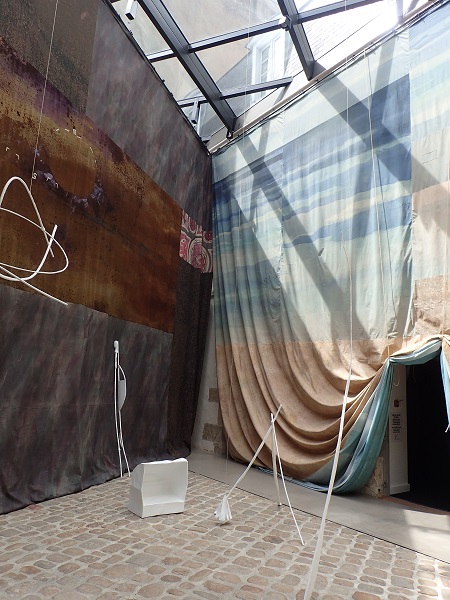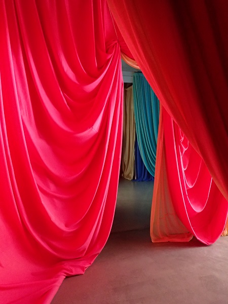 Au-delà de la proximité temporelle avec sa monographie du Palais de Tokyo (une petite année sépare la fin de celle-ci du début de la présente monstration), c’est aussi un voisinage d’intitulé qui caractérise cette nouvelle proposition d’Ulla Von Brandenburg : Le Milieu est bleu en 2020, Ombres bleues et jaunes en 2021. Plus encore, avant même de pénétrer dans le Passage Sainte-Croix, le visiteur familier de l’œuvre de l’Allemande aperçoit ses tentures et autres drapés tenus par des fils, délimitant les salles et structurant l’espace. Intégrée dans la nouvelle édition du Voyage à Nantes, cette exposition permet de retrouver les motifs de la plasticienne, entre inspirations théâtrales et travail sur la représentation.