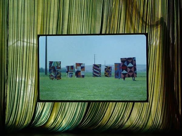 Tous recouverts de ces rideaux et tissus aux couleurs chaudes, murs et portes créent une atmosphère chaleureuse et immersive, dans laquelle le spectateur est invité à se poser, notamment pour regarder deux films de 2017, réalisés en super 16. Dans le premier (Quilts), d’immenses patchworks avancent, portés par des intervenants qu’on ne voit pas, tandis que, dans le second (C, Ü, I, T, H, E, A, K, O, G, N, B, D, F, R, M, P, L,), la caméra progresse en naviguant au milieu de drapés, les écartant au fur et à mesure de son avancée. Placé chacun dans une pièce différente, ces deux vidéos dialoguent assurément : le tissu vient à nous dans le premier cas, nous traversons les tissus dans le second ; au caractère muet du premier répond un chant féminin dans le second, interprétant un poème ânonné lettre à lettre.