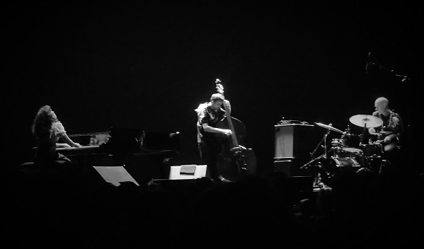 C’est ainsi que Rouge passa d’un jazz un peu fiévreux à des propos syncopés (marqués par des ostinati très rythmés à la main gauche), puis des titres plus singuliers, dans lesquels Madeleine Cazenave jouait du piano préparé (bandelettes collées sur certaines cordes, cordes pincées plutôt qu’appuis sur les notes pour y faire percuter les marteaux). De son côté, la contrebasse de Sylvain Didou était principalement manipulée en pizzicati mais aussi, plus rarement, à l’archet pour, là aussi, faire évoluer les propositions. Soutenu par des lumières soignées (des tons bleutés, orangés ou blancs), le trio se trouvait souvent en contre-jour, découpant les musiciens en ombres chinoises, ou bien les accompagnant, sur le mur du fond, de vibrations façons reflets mouvants, comme d’habiles relais de leurs propres vibrations musicales.