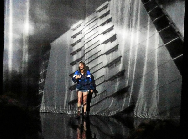 Pour incarner ce personnage, Lena Paugam (interprète et metteuse en scène) s’est affublée d’un simple short en jean et d’un blouson de survêtement, tenue passe-partout qui traduit bien la volonté universaliste du propos (aucun lieu n’est identifiable, aucune borne temporelle n’est donnée hormis l’existence de BFM-TV, aucun nom n’est prononcé). Le visage dur et sec de la comédienne se fait alors assez raccord avec un texte asséné sans ciller, pendant une heure et quart, tandis que des vues des barres d’immeuble, et des morceaux de phrase, sont projetés sur un drap en fond de scène.