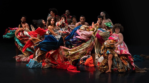 Point d’orgue du « portrait » que lui consacre le Festival d’Automne cette année, Encantando, nouvelle création de Lia Rodrigues, est donnée pour une semaine au Théâtre de Chaillot. Pensée pendant les différentes périodes de confinement, cette chorégraphie débute par une mise en place assez longue, le temps de dérouler une sorte de tapis qui s’avère un assemblage de morceaux de tissus colorés dont chacun des interprètes va se saisir ou s’habiller par la suite.