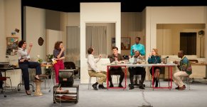 À cet instant, on ne rit pas tellement de ce qui est montré, mais de ce qui est dit avec la conscience de ce qui s’est finalement passé, ce qui est advenu du fameux « mieux-disant culturel », et des annonces faites ce jour par l’aéropage entourant Bouygues : pas de dessin animé japonais, des représentations en direct de Bayreuth ou des captations du Mariage de Figaro monté par Jean-Pierre Vincent ! Au-delà de cette séquence, Thomas Quillardet sait aussi nous amuser en exposant quelques saynètes typiques de la vie de bureau, montrées dans leur quotidien (blagues plus ou moins lourdes entre collègues, drague plus ou moins dissimulée, petites jalousies et mesquineries, etc…) car, avant d’être le bureau d’une rédaction d’information, il s’agit bien d’un bureau comme tous les autres, avec ses chefs et ses téléphones, ses stagiaires et ses machines à café.