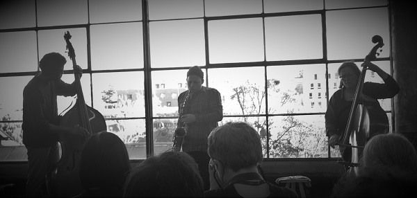 Avant d’intervenir le soir même dans un autre lieu d’Ivry-sur-Seine, Joëlle Léandre était conviée à rejoindre deux musiciens qui étaient intervenus la veille, au sein d’un ensemble plus large. C’était donc une sorte de rencontre un peu impromptue, entre des temps plus officiels, propre à amener à une séance d’improvisation, alternant trio et duos, et mettant aux prises deux contrebasses et un saxophone alto. Sans qu’on sache si les musiciens avaient eu le temps de se concerter au préalable, ils rentraient tout de suite dans le vif du sujet, sur chacun des morceaux proposés, conservant la même densité et la même impression de fièvre passagère avec des morceaux assez peu longs. Luke Stewart proposait un travail quasi-percussif de sa contrebasse, laissant presque davantage entendre les frappes sur ses cordes slappées ou jouées étouffées que les notes jouées en tant que telle, frottant la partie du manche située au-dessus de la table d’harmonie, ou brossant même le sol cimenté avec la pique de son instrument (cette tige métallique qui permet de le relier au sol).