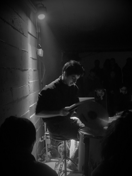 Après avoir traversé l’œuvre Was ist das ? du duo Nicolas Barreau et Jules Charbonnet (pan incliné en bois qu’on ne peut franchir que par une toute petite ouverture, qui ne s’emprunte qu’en se mettant accroupi), on pouvait rejoindre la salle de concert du Blockhaus DY10 pour une nouvelle programmation du set/30’. Venu complètement à l’aveugle à ce rendez-vous régulier du vendredi soir, on y découvrit une batterie « arrangée » (pierres et feutrine posées sur les fûts), derrière laquelle s’assit un jeune homme, pour la demi-heure réglementaire.