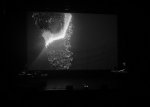 Venant d’un autre concert, donc, nous ne pûmes assister qu’aux dix dernières minutes du set de Sahar Homami, iranien.ne à l’électronique plutôt fine, agrémentée de visuels de lignes blanches et de formes géométriques numériques. Dans la salle Maxi, Cyril Meroni & Olivier Vasseur s’étaient installés pour offrir une électronique assez basique, heureusement rehaussée par une vraie batterie, jouée en direct, au son clair et aigu. Les frappes sur les fûts et cymbales résonnaient, en outre, bien avec l’aspect minéral des compositions projetées en fond de scène : roches et autres blocs pierreux en 3D, avec modélisations et tracés lumineux réalisés sous nos yeux. Vers les deux-tiers de leur prestation, les deux Français introduisirent un intermède scientifique autour du concept d’entropie ; trop abscons et trop long, ce passage égara quelques spectateurs, dont il faut reconnaître que nous fûmes.