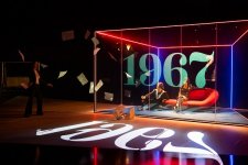 Sur un sol où se dessine un grand triangle blanc, le plateau est doté d’un caisson, utilisé pour créer une perspective, délimiter une pièce (l’intérieur de la Factory, la chambre de l’hôpital psychiatrique où elle sera internée après la tentative de meurtre) ou bien servir de support à quelques projections. Plutôt sobre, cette scénographie autorise plusieurs usages et des gestes assez inventifs. En parallèle, le texte de l’autrice suédoise se montre un peu trop démonstratif, ressassant les mêmes formules (écrites par Solanas elle-même, dans le SCUM Manifesto, son pamphlet féministe et anti-patriarcat) et les mêmes souvenirs (à l’image du viol perpétré par son père, raconté plusieurs fois, à plusieurs moments du spectacle). Cela conduit alors à une forme de complaisance qui vient, malheureusement, prendre le pas sur la radicalité voulue du propos.