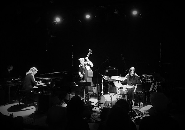 Pour ouvrir les débats, en ce lundi soir gentiment rempli, un trio international prit place : Kirke Karja au piano, Étienne Renard à la contrebasse et Ludwig Wandinger à la batterie. Constitué depuis deux ans, le trio offrit un jeu d’ensemble un peu et sec et percussif, avec peu de place (sauf à quelques endroits, tels l’ouverture de Miniature) pour la rondeur de la contrebasse du Parisien ou un semblant de mélodie. Au contraire, le Berlinois frappait sur ses nombreuses cymbales (la plupart étant tordues), utilisait une grande feuille de papier prise dans un cerceau, frottait des tiges de fer contre ses disques métalliques pendant que l’Estonienne travaillant ses notes de piano en pinçant les cordes de son instrument. Quelques accents plus nerveux se firent ensuite entendre dans des passages free, mais le trio se distinguait, en réalité, par un regard surtout porté vers la musique contemporaine ou concrète. Kirke Karja livrait peu de mélodies, donc, mais un jeu très rapide et frénétique du piano, allant chercher les notes très aigues ou très graves de son clavier.