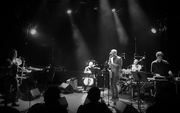Pensé comme un hommage à Ryūichi Sakamoto, le projet Asynchrone est formé autour du claviériste Frédéric Soulard et du violoncelliste Clément Petit. Entouré d’autres instrumentistes (cuivres, flûte traversière, piano et batterie), ce duo partit effectivement, sur quelques pistes, de lignes sérielles qu’on put assimiler à des compositions du Japonais. Globalement, le sextet se montra ainsi plus pertinent quand il agissait dans la sobriété : solo profond de clarinette basse d’Hugues Mayot accompagné par quelques notes de piano de Manuel Peskine, chant quasi a capella des six musiciens, tout juste soutenu par le violoncelle joué aux doigts avec beaucoup d’ampleur. Pour le reste, Asynchrone eut tendance à noyer les sonorités japonisantes sous des effets (même sur la flûte traversière de Delphine Joussein, synthés, boîtes à rythmes et nombreuses percussions sèches (sistre, claves, bongos, cloches…). Ce manque de délicatesse se retrouvait même dans les tenues de scène (gilet un peu arlequin de Vincent Taeger à la batterie, veste rouge trop grande et retroussée aux manches de Mayot). Le dernier morceau, avec sa ligne mélodique de violoncelle jouée de plus en plus vite, son travail sur le souffle détimbré du saxophone ténor et son piano opérant en accords, permit une fin plus apaisée.