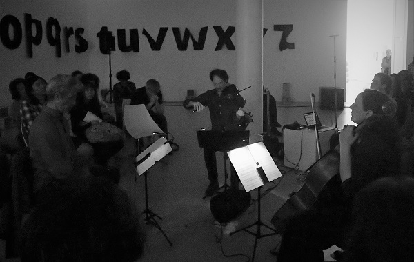Huit courtes pièces constituaient ce concert de début de soirée, réalisé devant un public plutôt nombreux et averti. Pour chaque pièce, il s’agissait, donc, d’illustrer les méthodes de disparition du son : fondu en sortie, recouvrement d’un son par un autre, enfouissement sous un amas sonore, arrêt net, fusion de deux sons pour ne plus en faire qu’un, etc… Après deux premières pistes sans électronique, celle-ci arriva pour Dans le Nuage de Bruit, morceau dans lequel un souffle composite, se chargeant progressivement de granulosité, prit toute son ampleur, a fortiori servi par la taille de la vaste salle aux murs blancs du musée, jusqu’à recouvrir les notes répétées de l’alto de Cyprien Busolini. Habitués, avec la violoncelliste Deborah Walker, de la musique contemporaine ou expérimentale (Stephen O’Malley, Bertrand Denzler, Jean-Luc Guionnet ou Quentin Sirjacq les ont, par exemple, sollicités), les deux joueurs de cordes purent, plus tard, offrir une pièce flirtant avec la disharmonie, leurs deux notes jouées simultanément frottant légèrement l’une contre l’autre, avant de se retrouver.