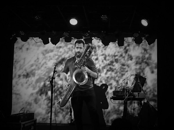 Au reste, c’est dans une ambiance très « club de jazz » qu’on se retrouva à l’heure de l’apéritif (le concert était annoncé pour 19h, afin de laisser la possibilité d’aller dans un autre lieu par la suite, toujours dans le cadre de Wine Nat / White Heat) : discussions plutôt feutrées malgré le bar généreux, petites tables rondes et chaises de part et d’autre en contrebas de la scène, salle située en sous-sol (sous la salle Paul Fort, dédiée à la chanson actuelle), début du set à l’heure pile, à la minute près, aspect un peu érudit renforcé par l’explication donnée par Jason Sharp sur sa pratique, avant de débuter. Doté d’un capteur qui lui ceinturait le torse et saisissait les battements de son cœur, le Canadien anglophone intégrait ainsi ces pulsations pour structurer la plupart de ses morceaux.