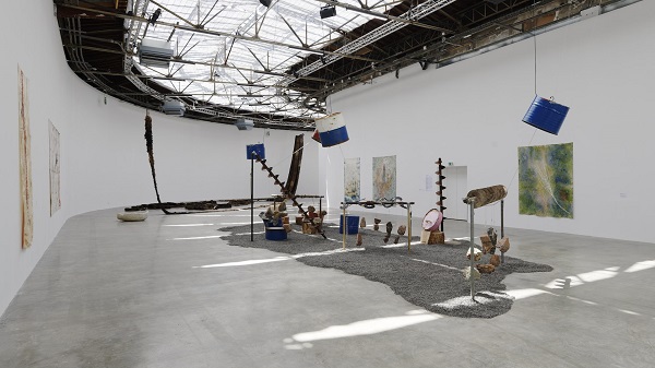 Histoire de renouveler un peu l’ambition des expositions à visée écologique, et sortir de l’opposition humanité/nature, le Palais de Tokyo offre, entre deux fermetures pour cause de canicule ou de travaux, une grande partie de son niveau d’entrée à Réclamer la Terre. Articulé avec la saison « Australia Now », et conviant, de ce fait, plusieurs artistes de l’île-continent, le parcours fait volontiers le lien avec des pratiques chamaniques, vernaculaires ou ancestrales, dans un registre moins culpabilisant que la plupart des propositions vues récemment à ce sujet. En fait, ici, il s’agit de montrer comment l’homme ou la femme peuvent faire corps avec la nature, entendue stricto sensu (minéraux, végétaux, cours d’eau, vent, feu) et non étendue au vivant non-humain.