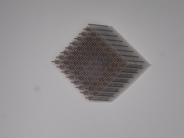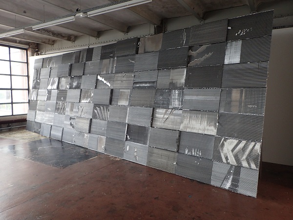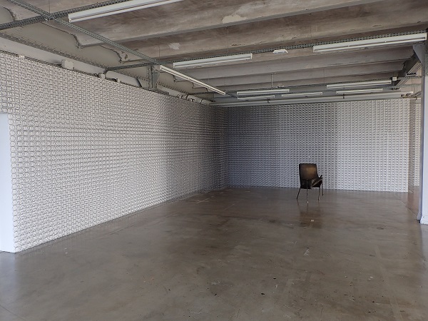 Qu’importe, après tout, cela permet aussi de goûter une proposition sans filtre et d’apprécier, par exemple, ces jeux optiques dont celui qui occupe deux larges murs de la salle principale, avec ses ressorts de matelas disposés sur toute la hauteur des parois, parfois sur plusieurs épaisseurs, donnant une impression de profondeur quasi-vertigineuse (multispires). Plus ramassé dans son expression, BIC juxtapose de nombreux corps de stylos à bille cristal, dont certains ont été évidés de leurs mines. Le losange ainsi formé travaille sur la perspective et un effet de déplacement statique très réussi. À travers ces deux œuvres, c’est aussi une approche de la sérialité qui transparaît, qu’on retrouve dans OTS, immense patchwork de radiateurs de voiture, ou dans conCav extra blanc, superposition de feuilles de papier.
