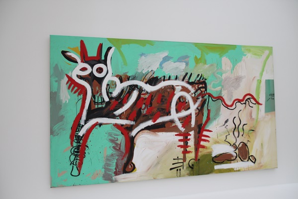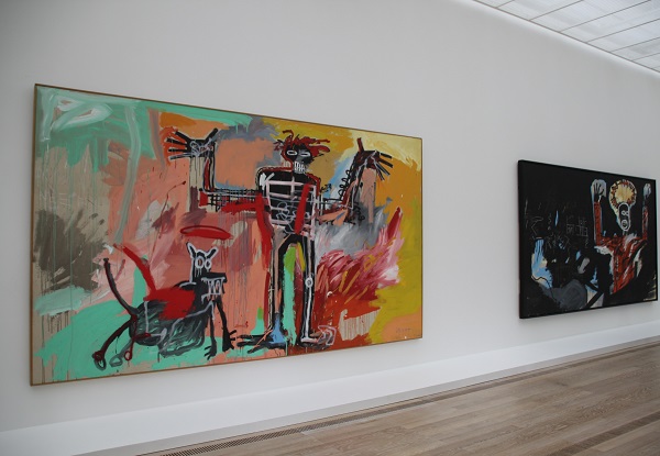 Placées en majesté dans les vastes espaces du bâtiment créé par Renzo Piano, ces peintures se trouvent, en effet, pour la première fois exposées ensemble, dans la plénitude de leurs quatre à cinq mètres de large, et avec le recul nécessaire pour embrasser pleinement ces toiles. Le geste de l’États-Unien se fait vite familier, avec ses personnages très expressifs et tracés à gros trait, la présence de mots et symboles disséminés sur la toile et la superposition de différents registres (peinture traditionnelle, intervention à la bombe, graff). Sur le fond, le diptyque Untitled (Angel) / Untitled (Devil) fait son effet, avec l’auréole du premier et les coulures de peintures qui recouvrent le visage du second. De même, le lien avec les origines caribéennes de Jean-Michel Basquiat, via la figure de Baron Samedi, présente dans The Guit Of Gold Teeth, marque le parcours du plasticien.