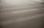 Mais, assez vite, l’ensemble prend des atours un peu plombés, comme si le propos était asséné et empesé, à l’image de ces niches percées dans le mur pour y accueillir des paires de chaussures et fermées par des pellicules de peaux qui apporte une coloration jaunie à ces alcôves. Comme le démonstratif guette aussi Doris Salcedo, on finit par être lassé par cette accumulation insistante qui, comme souvent, dessert les intentions en martelant le message. Et puis arrive Palimpsest, installé dans la plus grande salle de la Fondation, vide au premier coup d’œil mais, en fait, recouverte de sable et irrigué par un réseau souterrain permettant de former des noms en gouttelettes d’eau. Séchant avec la température ambiante, ces patronymes sont ensuite remplacés par d’autres, dans un mouvement d’apparition et de disparition aussi poignant qu’ingénieux. Dédiée à tous ces migrants morts en voulant rejoindre l’Europe, Palimpsest peut, chose peu commune dans ce type d’exposition, se traverser afin de se mettre au milieu de ces noms, souvenirs de personnes emportées par leurs rêves d’ailleurs. Minimale dans son expression, mais maximale dans l’émotion qu’elle suscite, cette pièce justifie, à elle seule, cette monographie.