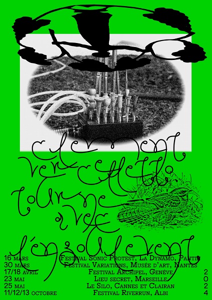 Tout autant passionnant dans son dispositif, le set de Clément Vercelletto se tint au même endroit, dans ce foyer de la Dynamo de plus en plus rempli (aucune place, ou presque, n’était en vente au guichet). Les affaires de 300mA ôtées, le Français put positionner au sol de gros tuyaux, serpentant depuis un souffleur et une interface MIDI, et alimentant divers tubes (tuyaux d’orgue isolés, appeaux à oiseaux, grosse flûte) installés verticalement. Dénommée « L’Engoulevent », son installation produisit une suite de notes permettant la mise en place d’un tapis sonore sur lequel le musicien vint, déambulant au milieu de son attirail, ajouter des notes de cornemuse, afin de constituer une variété de bourdon vernaculaire, au volume sonore de plus en plus poussé.