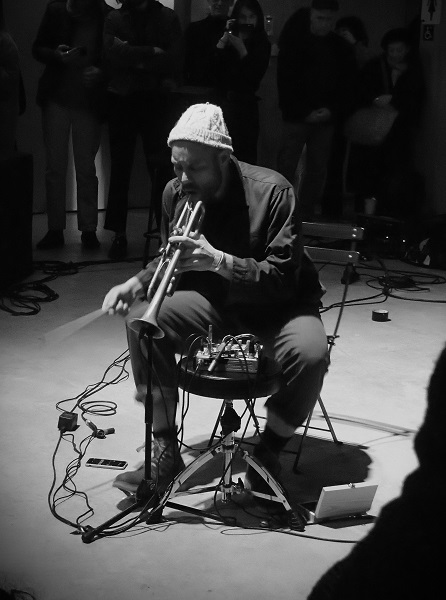 Poursuivant un mouvement de balancier impeccablement réglé (les sets débutèrent tous à l’heure), on revint dans le foyer pour voir Timothée Quost, assis sur un tabouret, une trompette vintage à la main, dont le pavillon fut enfoncé sur un long micro. Joué de manière effrénée ou détimbré, tapé par une baguette ou tapoté des doigts, l’instrument donnait des sons bruts et expérimentaux, relayés par quelques grelots agités près du micro ou des cris donnés directement par le Français dans le bec de sa trompette. Très physique, cette prestation confirma qu’à Sonic Protest, le spectacle était autant visuel que musical, voire parfois plus visuel que musical. Sur cette réflexion, nous quittâmes la Dynamo, faisant l’impasse sur les quatre dernières propositions de la soirée, et clôturant notre relation avec Sonic Protest… mais pas avec Banlieues Bleues.