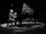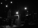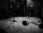 Le temps d’enlever les chaises et de positionner un piano à queue au centre de l’espace, et on put revenir dans cette même salle, pour assister au duo AGNel/dANG ou, comme le dit joliment un voisin, une pièce « à deux corps et quatre mains ». Postées toutes deux derrière le piano, Sophie Agnel et Barbara Dang livrèrent un concert de piano préparé en direct (dit « piano étendu »), avec un gros travail de manipulation au fur et à mesure, particulièrement porté sur les cordes de l’instrument : tapées du plat de la main pour faire des rythmiques, pincées pour produire des aigus, frottées avec divers ustensiles, détimbrées, etc… Pendant que l’une de leurs mains jouait des notes, l’autre main actionnait les cordes, ou alors une des musiciennes s’occupait du clavier et l’autre du corps du piano. Improvisée, leur prestation était donc très physique, les musiciennes passant l’une sous l’autre, ou l’une derrière l’autre, pour se relayer dans les graves et les aigus. Musicalement, les sons heurtés alternaient avec des fragments sonores, entrecoupés d’appuis singuliers et contemporains.