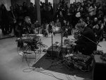 Avec leurs longs manteaux élimés, leurs valises défraichies d’où ils tirent toutes sortes d’objets fatigués et leurs barbes grises, les deux compères de 300mA tiennent largement des Vladimir et Estragon de Samuel Beckett. Assis au milieu du hall de la Dynamo, ils étaient donc entourés d’un grand nombre d’accessoires, à même de les aider dans la production d’une musique électroacoustique : cymbale cassée, kalimba rafistolé, plaque de cuivre usée, harmonica hors d’âge, cümbüs désaccordé, mini-accordéon raccommodé, gros ressort corrodé, etc… Avec un marteau et une tige, une batterie se créa sur la valise de Jean-François Plomb ; avec deux gros élastiques et un cône métallique, une rythmique put naître et avec du bricolage, un univers apparut, hors du temps, traversé de samples et lectures de Damien Grange. Possiblement un peu trop long, ce concert se montra néanmoins visuellement captivant.