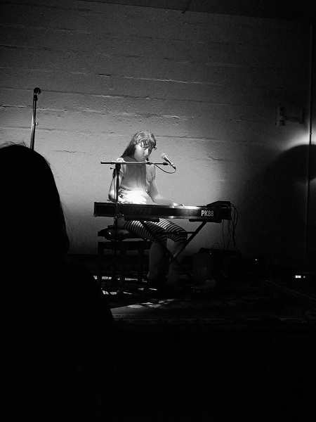 Avec sa voix aigüe, sertie de trop de réverbération, Clarissa Connelly donnait des paroles difficilement compréhensibles, avec des lignes de texte se superposant. Sachant passer à la guitare électrique, jouée en arpèges, pour deux morceaux, celle qui vit dorénavant à Copenhague, n’y convainquit pas davantage, restant dans un registre très mainstream. Quand une rythmique basse-batterie pré-enregistrée fut lancée depuis son synthé, on se dit qu’on y trouverait peut-être un peu plus d’intérêt, mais le chant ne se cala ni sur le même tempo, ni forcément sur la même tonalité, donnant le sentiment étrange de quelque chose de pas travaillé, et finissant de nous laisser à la porte de cette prestation.