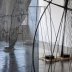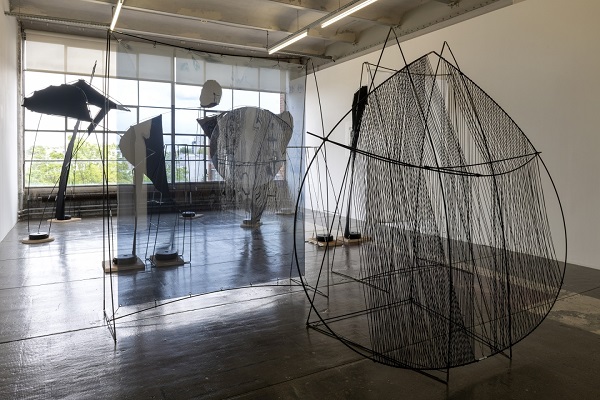 Installée dans deux salles du Crédac (les deux autres étant dévolues à une exposition collective moins intéressante), la trentenaire y met en place une grande installation et une vidéo. Faite de sculptures légères, panneaux ou oriflammes tenus par de fines tiges, l’installation invite le spectateur à déambuler en contournant ces formes, les évitant soigneusement, contemplant l’une à travers l’autre, allant chercher un coin de ciel bleu par-delà une troisième et la baie vitrée du Crédac, etc... Passant dans la salle de cinéma, on retrouve quelques-unes de ces sculptures qui, une nouvelle fois, perturbent un peu le champ de vision et nécessitant de se mettre de biais pour bien voir le petit quart d’heure diffusé sur l’écran.