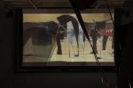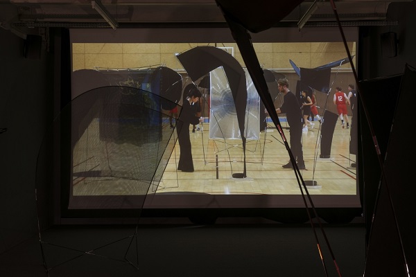 Tourné en février 2024 dans un gymnase ivryen, le film de Julia Broderie reconstitue un match de basket-ball entre les deux clubs précités venant de deux villes amies et reliées par l’existence, en leur sein, d’un lieu d’art contemporain avec le Crédac et le MAC/VAL (l’exposition passera, d’ailleurs, de l’un à l’autre). En l’absence de spectateurs, mais avec deux arbitres professionnelles, les équipes mixtes se livrent un match sans trop d’engagement, dans lequel les airballs et autres ratés s’enchaînent au début. Quand les paniers commencent à rentrer, des assistants pénètrent sur l’aire de jeu et disposent progressivement (à chaque panier marqué, en fait), l’une des fameuses sculptures sur le parquet. Les joueuses et joueurs doivent, alors, poursuivre leur affrontement, mais avec des déplacements entravés et des lignes de passe coupées. Le visiteur s’identifie ainsi aisément à ces protagonistes, ayant vécu une expérience similaire, dans une forme de pas de côté bien singulière et rafraîchissante.