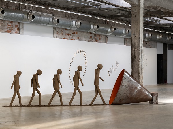 Ce qui frappe immédiatement, c’est la tonalité d’ensemble des œuvres, jouant sur une palette verte et brune, entre végétation (le disque de mousse Semper Virens) et sculptures en terre (la tête géante du Regardeur, le corps disproportionné du Cobaye ou les quatre sphères représentant les possibles Planètes B, C, D,… ? - bien qu’on sache que « there is no Plan(et) B » -). Travaillées et malaxées, ces deux sources disent assez aisément la relation de Gloria Friedmann à son environnement, dans une logique de travail sur le rapport au temps, la Terre ayant, en apparence, davantage de perspective d’avenir que l’espèce humaine. L’évolution de cette dernière se trouve, d’ailleurs, reproduite dans Exodus, suite de cinq personnages qui paraissent se redresser progressivement (comme dans le célèbre schéma d’évolution de l’humanité du singe à l’homo sapiens) pour se diriger tout droit vers un entonnoir bouché (comme l’horizon de l’homme ?).