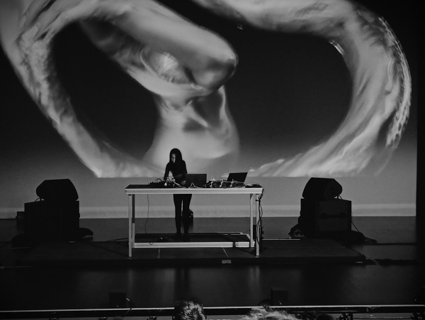Un peu dérangeante par endroits, notamment quand le corps flasque se reconstitue, la vidéo se trouvait bien accompagnée par les morceaux envoyés par Noémi Büchi, au long d’un set électronique qui fit la part (trop) belle aux morceaux arythmiques, sortes de longues transitions entre de rares pistes dans lesquelles on retrouva ses habituelles rythmiques concassées. Il en résulta un ensemble, probablement trop long, moins maximaliste et qui travaillait davantage sur l’étirement des sons, très bien accordé, sur ce point, avec le film. Quelques coups percussifs pointèrent, comme de rares notes de clavecin digitalisé (autre signature de la Suissesse), les premiers étant habilement associés à des coupes franches dans le montage vidéo. Habillée tout en noir, la musicienne parut moins engager son corps que lors du premier concert qu’on vit d’elle, laissant cela à la danseuse sur l’écran. En revanche, la sensation immersive était toujours aussi impressionnante, avec ces flashes stroboscopiques, en direction du public, en rythme avec les pulsations qui ponctuaient les titres joués : saccades, secousses puis répit.