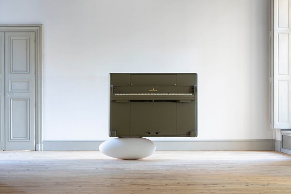 De fait, Seuil fait plus de dix mètres de long, The Relief (Steinway Victory Vertical, 1944) utilise un véritable piano et sa caisse de transport est exposée à ses côtés. Parti d’éléments d’archives témoignant de l’existence de pianos Steinway & Sons, construits par le fabricant étatsunien pour être transportés et utilisés sur le front européen (après avoir été parachutés) pendant la seconde guerre mondiale, Tarik Kiswanson en a retrouvé et restauré un exemplaire. Mais plutôt que de le placer en majesté, il le dispose sur une forme ovale blanche et lisse, semblable à un gros ballon de rugby. Précaire et jouant sur une forme d’illusion, la combinaison rappelle des agencements d’autres artistes, mais avec cette composante historique singulière, ainsi qu’une dimension narrative certaine.
