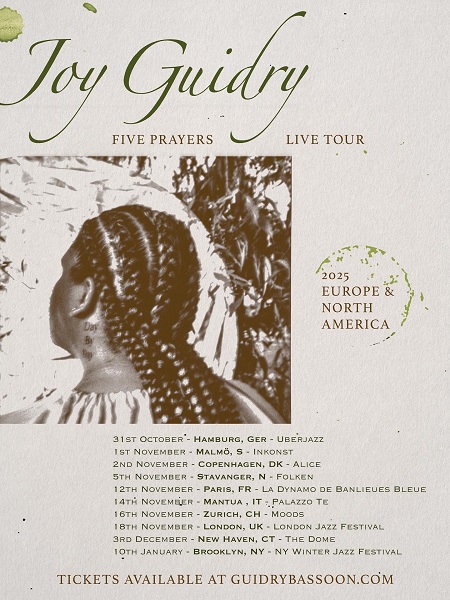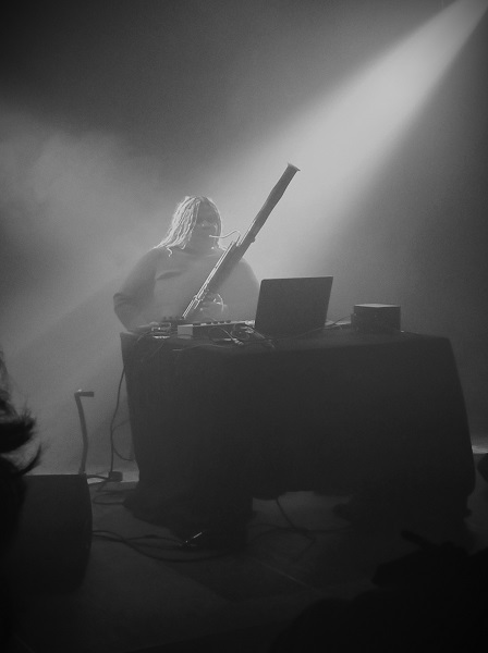 Assise derrière ses machines, la Californienne lança un bourdon, rejoint par des notes graves données par son basson, capable aussi de servir de vraies lignes mélodiques. L’écho sur cet instrument donnait un caractère aérien à l’ensemble, tandis qu’un côté un peu mystérieux résultait de la combinaison de la fumée et des lumières bleues venant de derrière la jeune femme. Joy Guidry superposa ensuite une deuxième ligne de basson à la première, puis tritura les deux à l’aide d’un séquenceur, de la saturation de quelques basses et de la pose de grésillements. Même dans une telle configuration, le propos maintenait son aspect langoureux comme la profondeur du geste et du souffle.