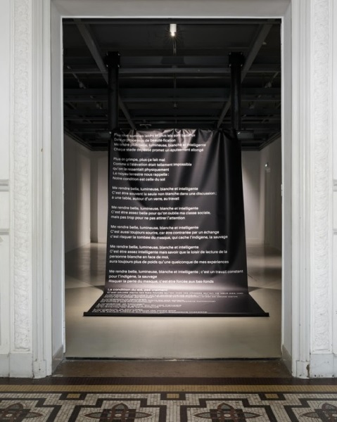 En ouverture d’une saison consacrée à des artistes nés dans les années 1990, la Galerie Édouard-Manet propose une exposition personnelle de Nesrine Salem, jeune femme attachée à une réflexion sur l’identité, émanant aussi bien de ses souvenirs d’enfance que de ses lectures récentes. Ce sont les secondes qu’on voit en premier en pénétrant dans l’espace, avec un long texte imprimé sur une toile enduite noire, suspendue en l’air de telle sorte qu’une partie du texte est à l’endroit et l’autre à l’envers. Plus loin, c’est une poutrelle métallique, sertie du mot « indig(è)ne » qui se trouve plantée dans le sol. Dans les deux cas, les œuvres, réunies sous cette appellation Indig(è)ne, essaiment puisque la toile s’étend sur une partie du sol du centre d’art, tel un tapis, et que la poutrelle paraît avoir été frottée et avoir laissé quelques résidus à son pied. Ainsi ancrées dans le sol, elles témoignent d’un enracinement à la fois des personnes concernées et des concepts ainsi travaillés.